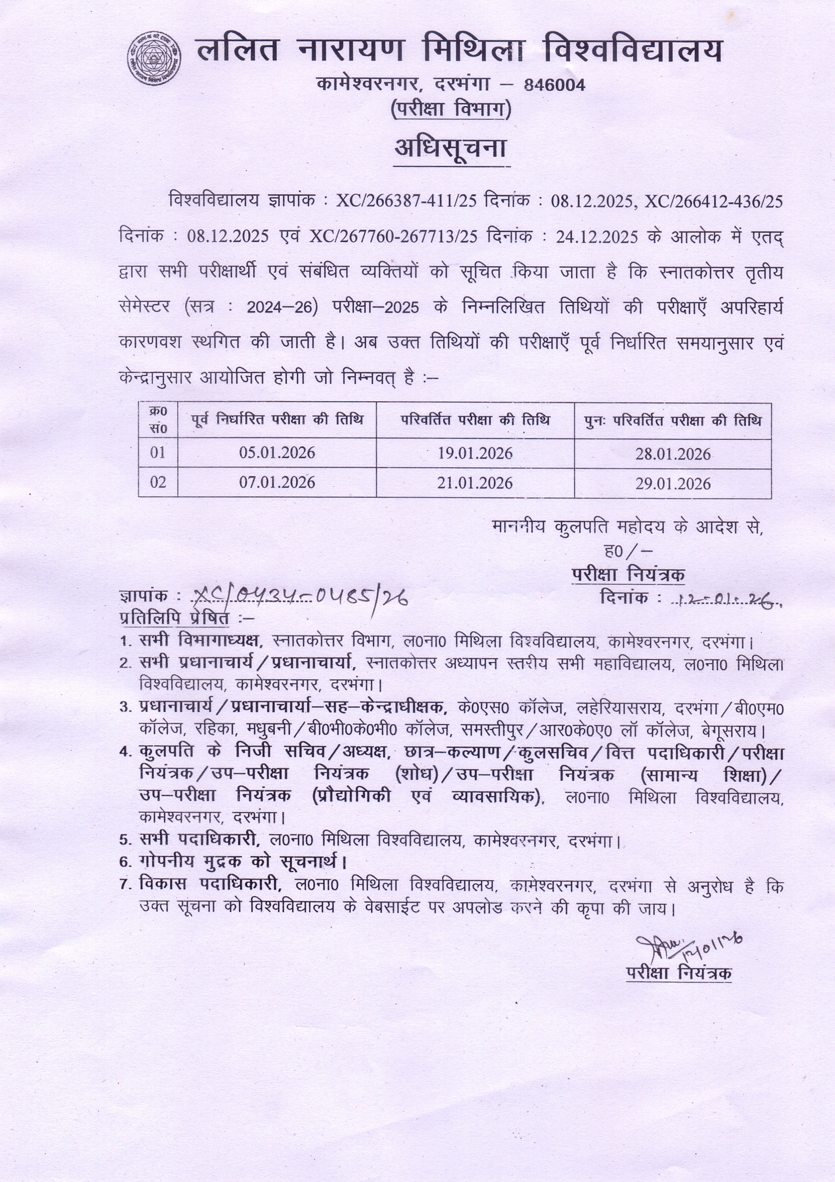 Notification of Date Reschedule for M.A./M.Sc./M.Com. 3rd Semester (Session : 2024-26) Examination - 2025