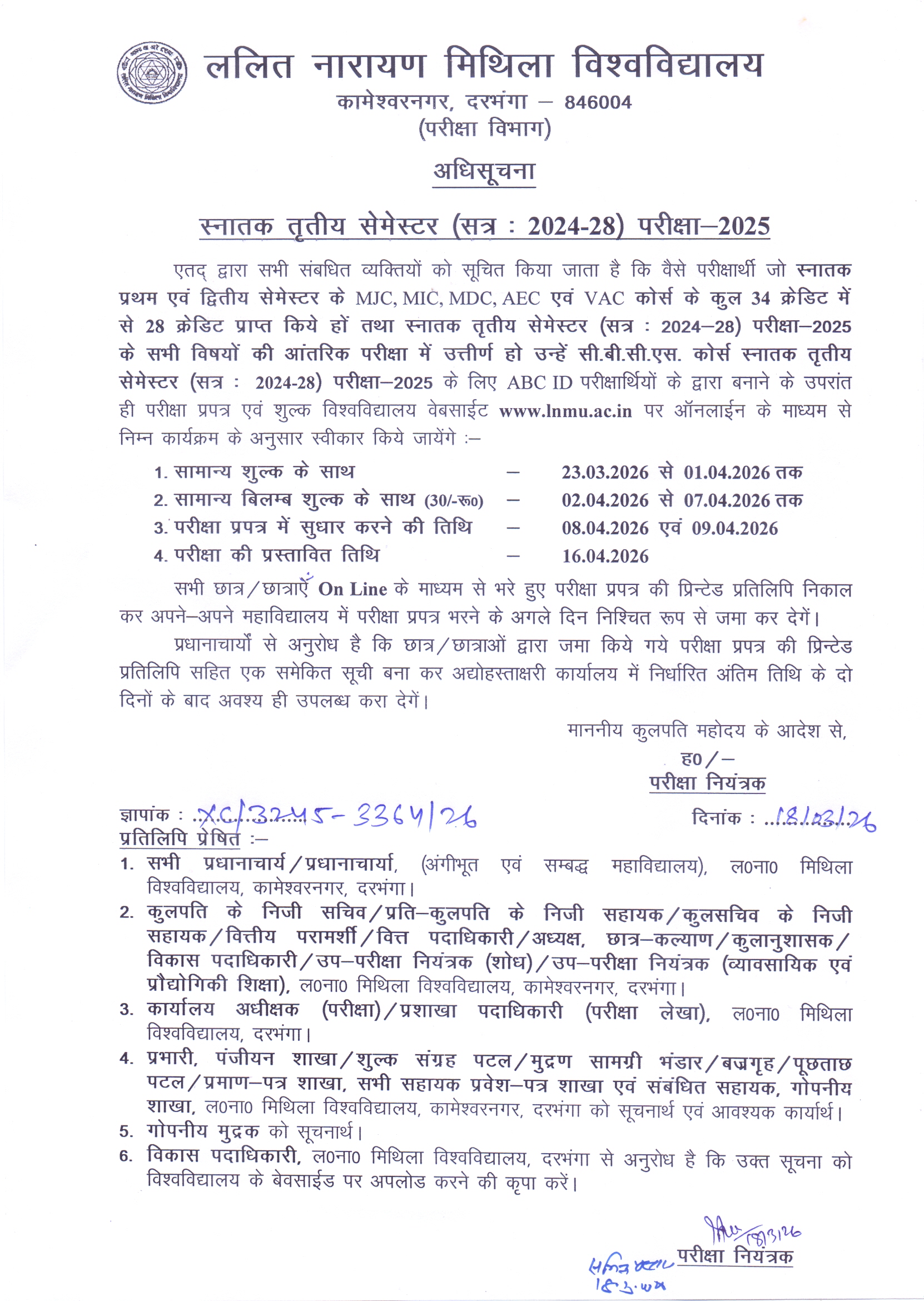 Notification of Examination Fee/Form & Examination programme for L.L.B. Part - III (Session : 2023-26) Examination - 2026